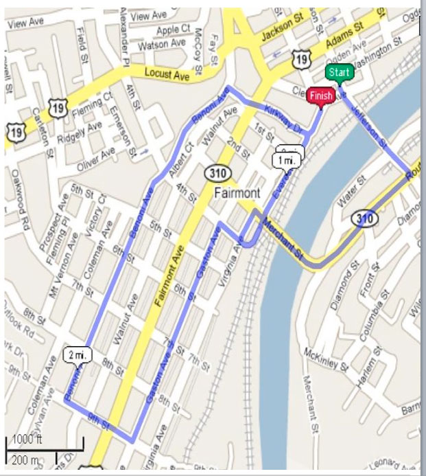 The 3.1 mile course begins at the Union Mission located at 107 Jefferson Street in Fairmont, WV. You will proceed across the High-Level Bridge, cross the 3rd Street Bridge, then circle around the Rescue Squad towards Coal Run Hollow. From there, you will proceed up Coal Run Hollow all the way to 9th Street, cross Fairmont Avenue, and then follow the relatively downhill grade of Gaston Avenue to 4th Street, then circle below the Rescue Squad to the finish line below the Union Mission. There will be one water stop located approximately halfway through the race.